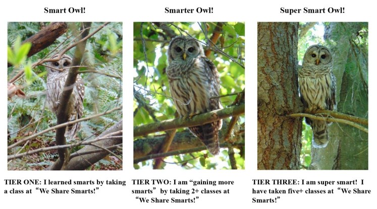 “We Share Smarts” has introduced learning tiers for “smart owls” who take our learning sessions (we have great names for our learning sessions: webinars, continuing education, etc.).